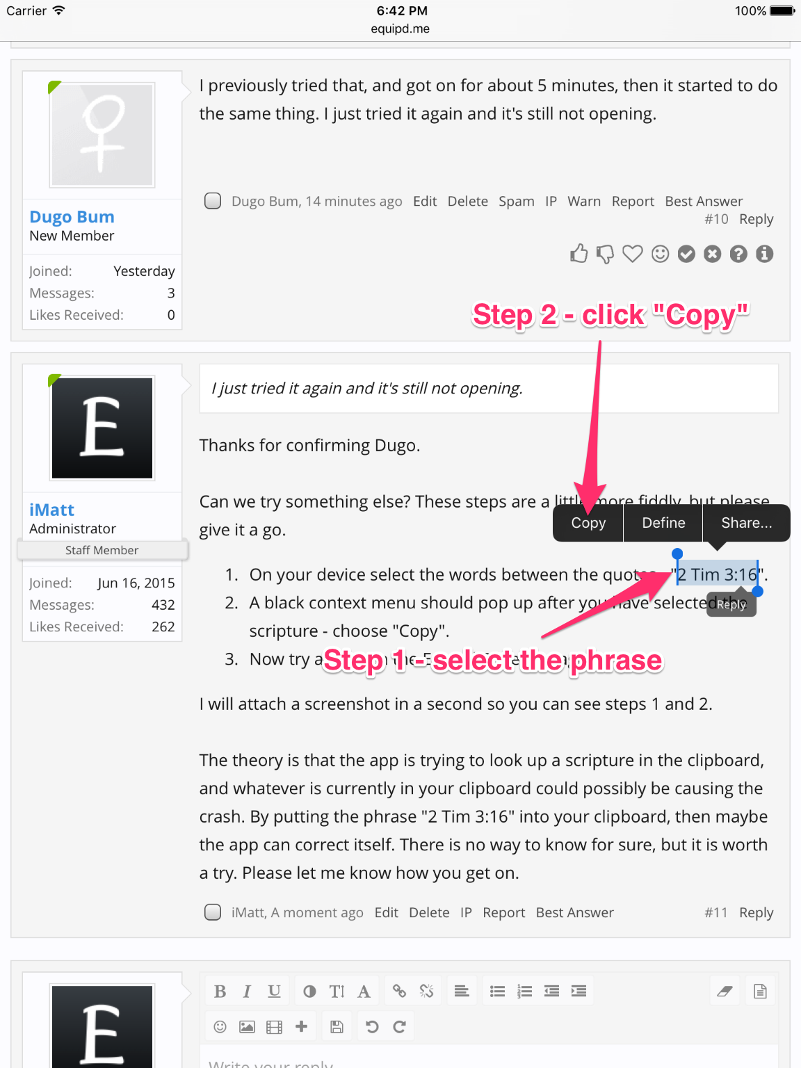 @Dugo Bum - Do you know how to select text and "Copy" it? You don't need to copy the exact phrase "2 Tim 3:16" - that was meant as an example to help you. If you know how to "Copy" text then just copy any text, from any app, and then try to open Equipd Bible.