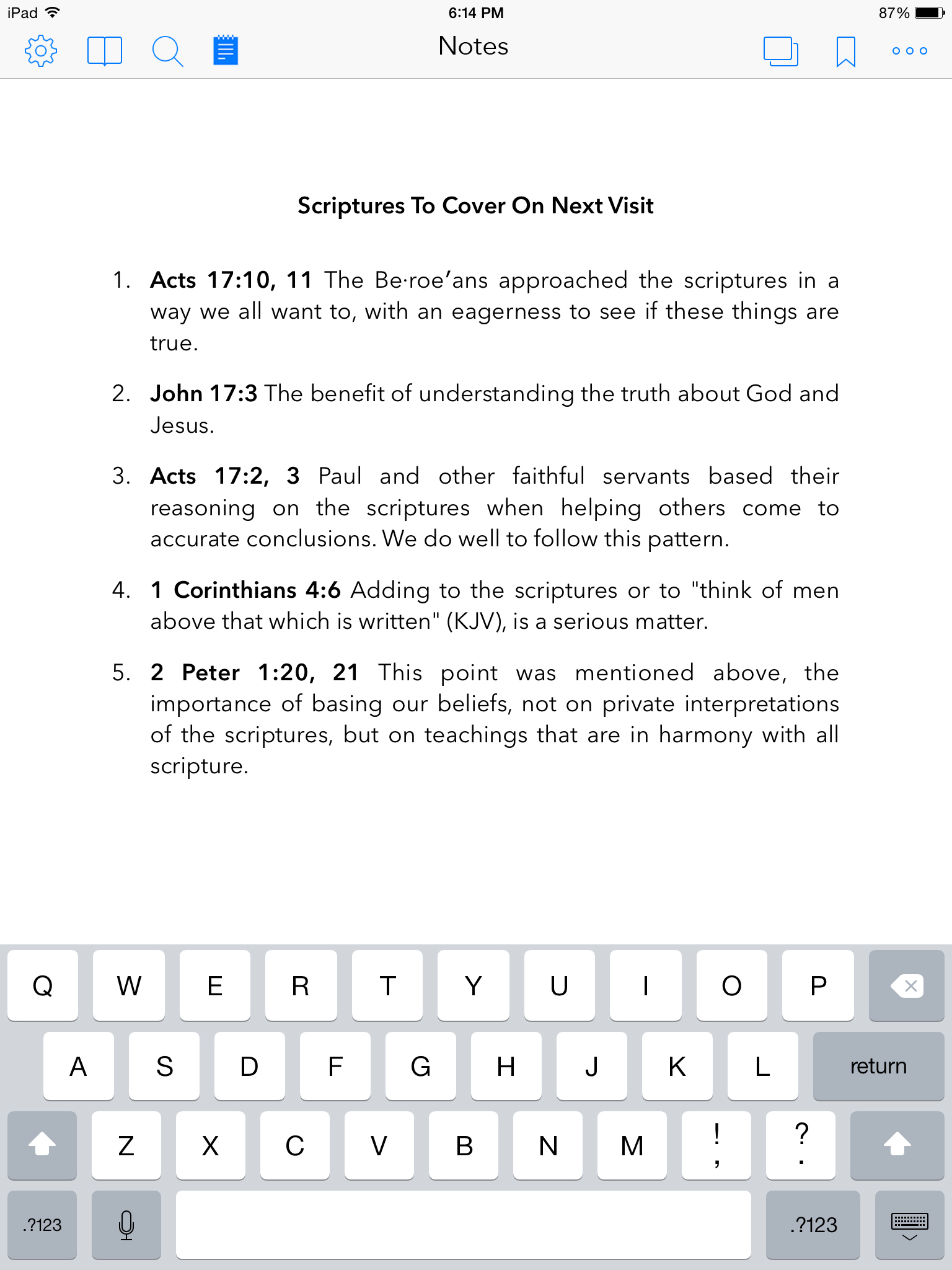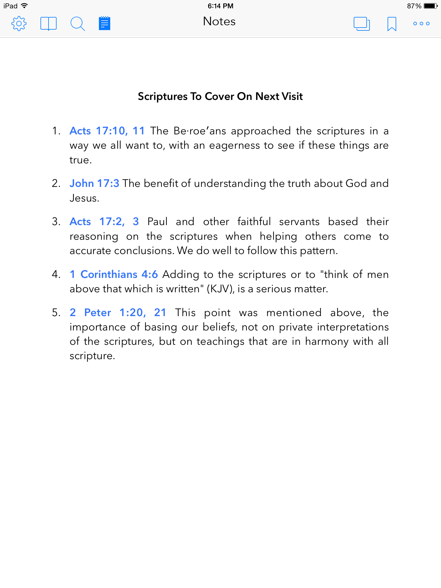 These notes could be especially useful when witnessing to people who currently want to use the Bible exclusively, without any additional publications. Brief notes beside each link would help remind you why you were reading each scripture, how one scripture related to the next, and allow you to quickly decide if some scriptures may not need to be considered with that particular person.