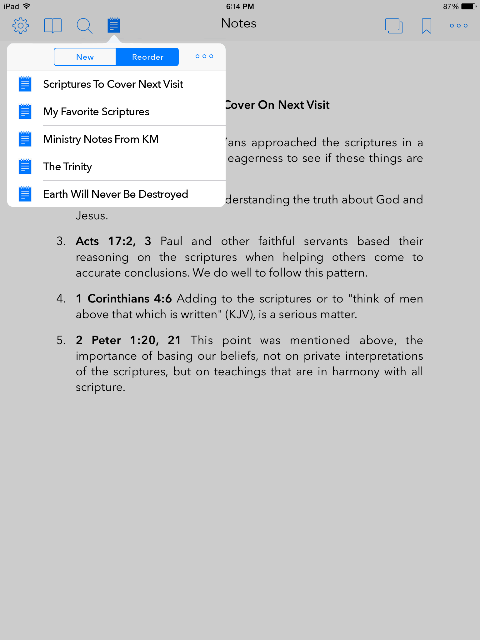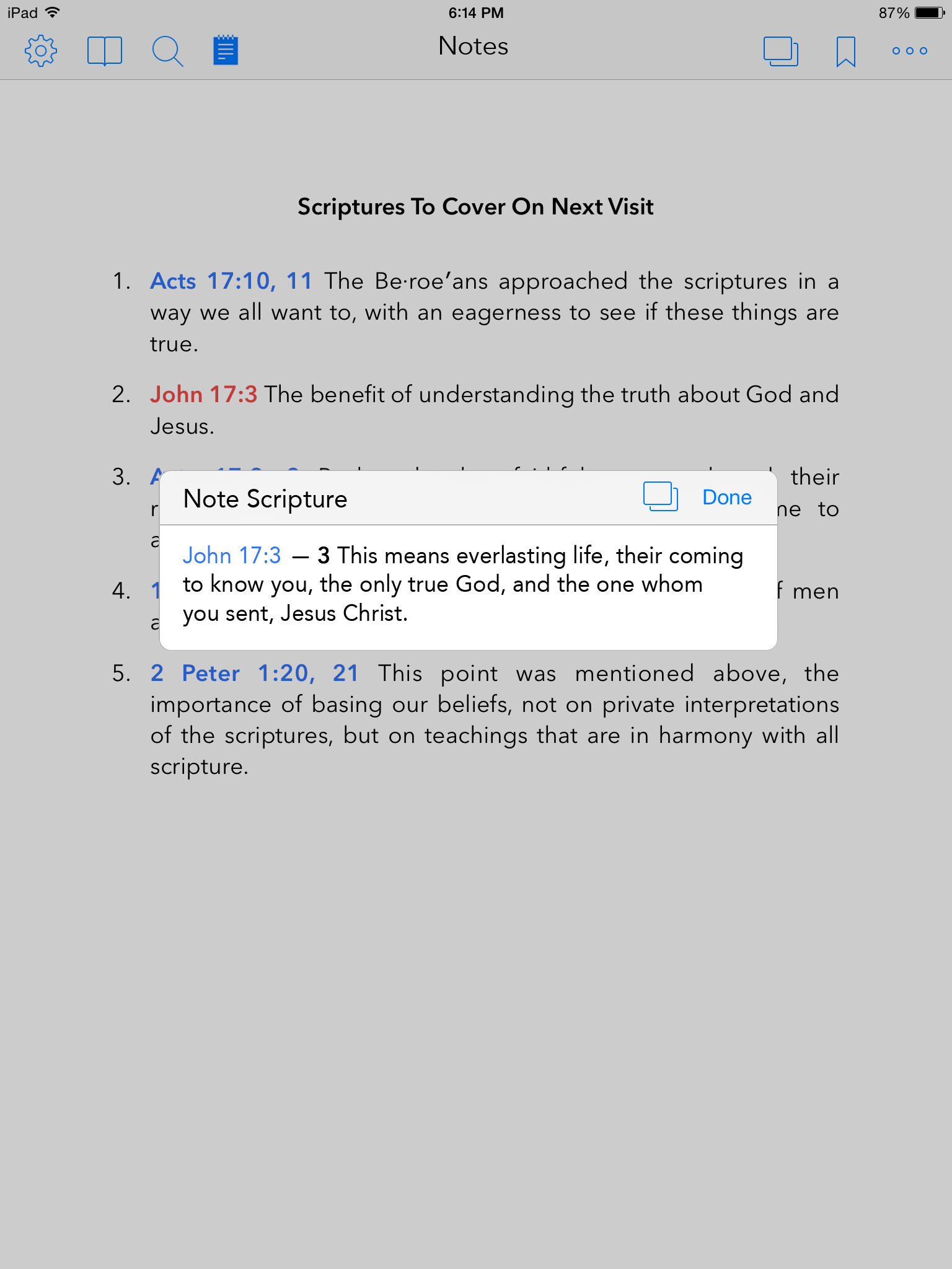 4. Each link could then be tapped on to bring up the verse in a pop-up window, without leaving your note.