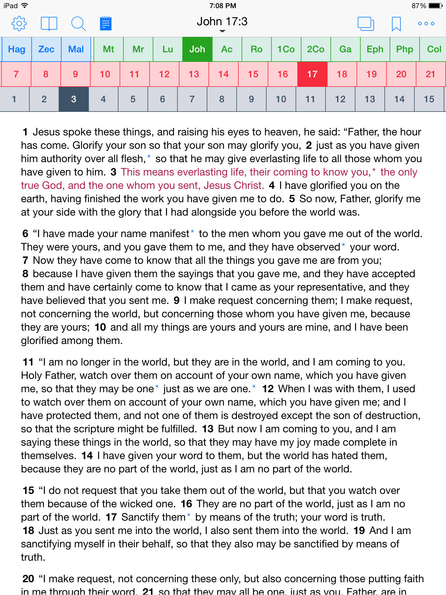 If you tap on a scripture it will open the scripture in the Bible window. And if you tap back on the toolbar button it will immediately open back to the same screen so that it is extremely easy to carry on where you left off.