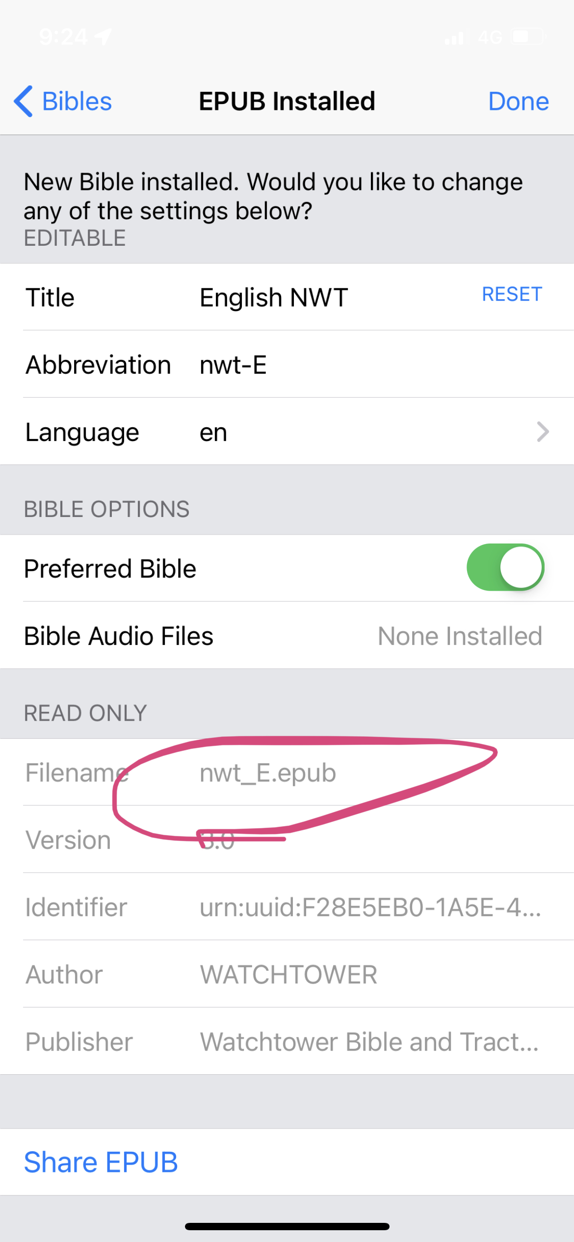 Closing this issue as it is now resolved. For others that may have this issue in the future, the problem was that the ePub was installed with the wrong file name. If you download the same file multiple times on iOS it will rename the file, adding 2, 3 etc to the end. You need to ensure that it is installed using the proper file name so that the notes match up. You can verify that it is correct in the Settings for the installed Bible as shown in the screenshot below…